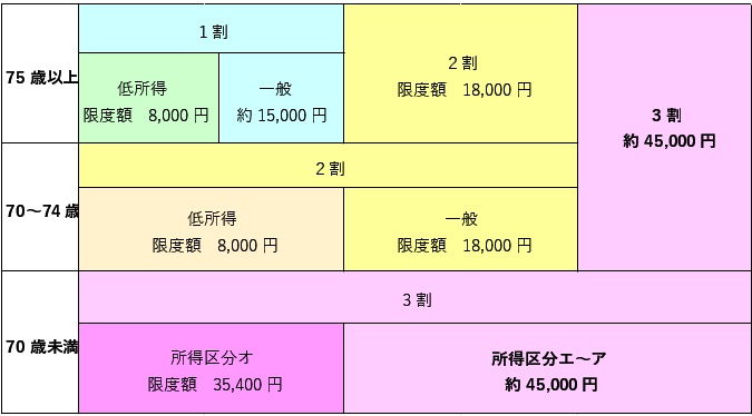 1割負担 8,000~18,000円※所得限度額による 2割負担 18,000円 3割負担 約75,000円