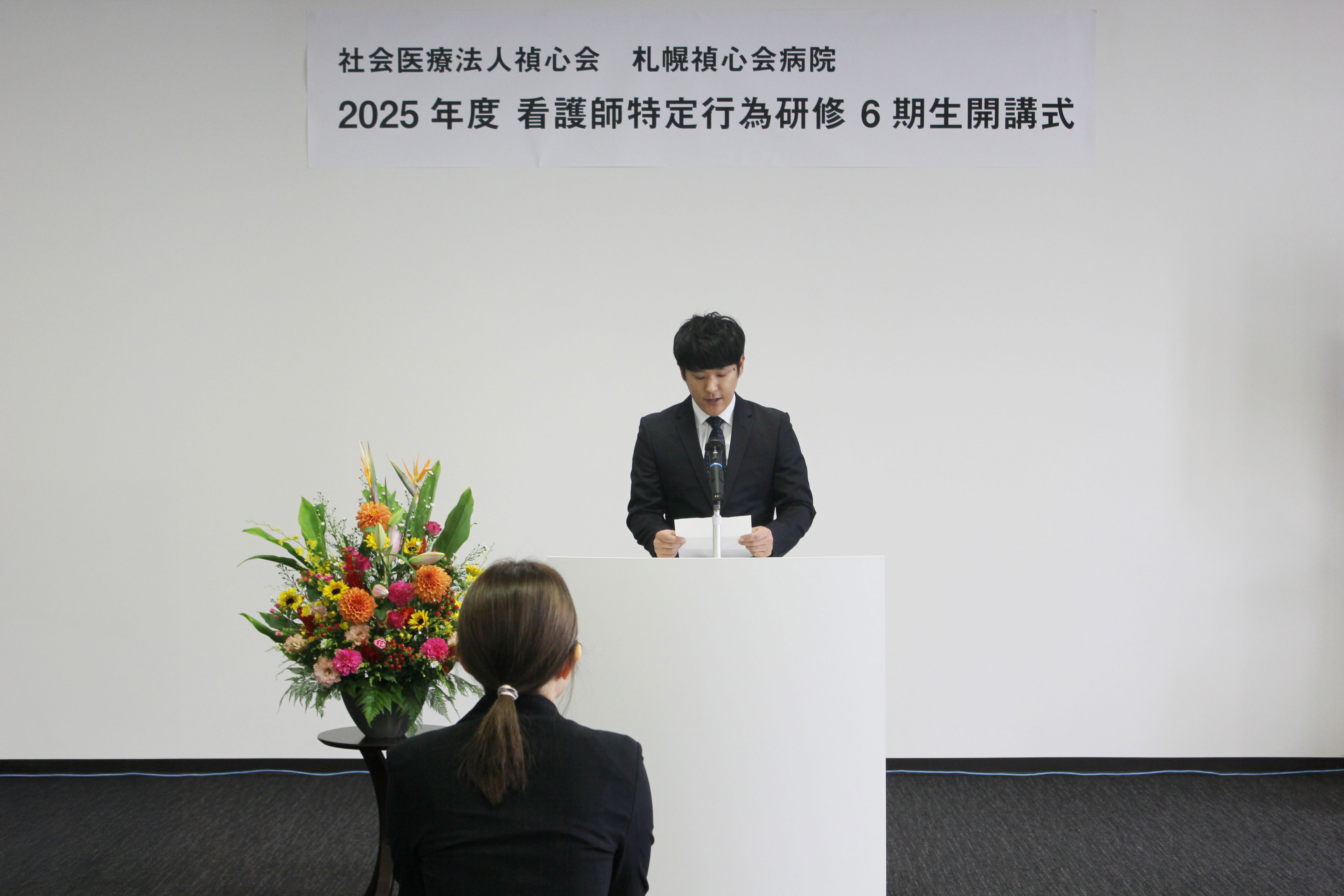 開講式では、徳田禎久院長より研修生へ激励と期待のお言葉をいただきました。また、研修生の代表からは、研修開始に向けた意気込みが述べられました。札幌禎心会病院の特定行為研修は、今年度で4年目となります。研修担当者や指導者のみならず、多職種からの研修サポートもいただきながら、充実した研修を目指していきたいと思います。